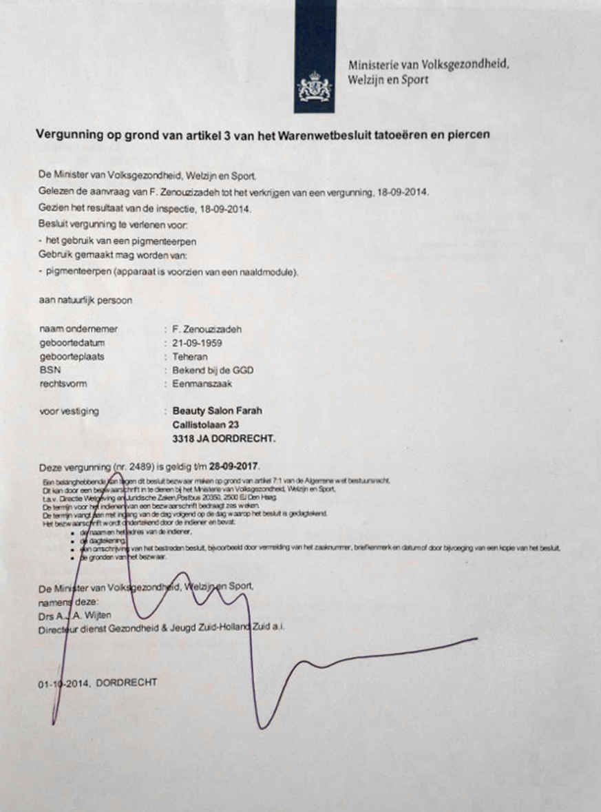 Voor het zetten en aanbrengen van permanente make-up is een vergunning nodig. De Gemeentelijke Gezondheidsdienst (GGD) geeft deze vergunningen. Beautysalon Farah is GGD-gecertificeerd. Bekijk hier de vergunning.